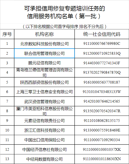 第一批可承擔(dān)信用修復(fù)專題培訓(xùn)任務(wù)的信用服務(wù)機(jī)構(gòu)總共有13家機(jī)構(gòu)入選,名單如下: