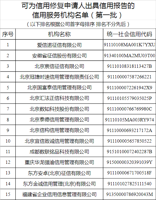7月2日,國(guó)家公共信用信息中心發(fā)布了《關(guān)于發(fā)布可承擔(dān)信用修復(fù)專題培訓(xùn)任務(wù)的信用服務(wù)機(jī)構(gòu)名單(第一批)的公告》和《關(guān)于發(fā)布可為信用修復(fù)申請(qǐng)人出具信用報(bào)告的信用服務(wù)機(jī)構(gòu)名單(第一批)的公告》。
