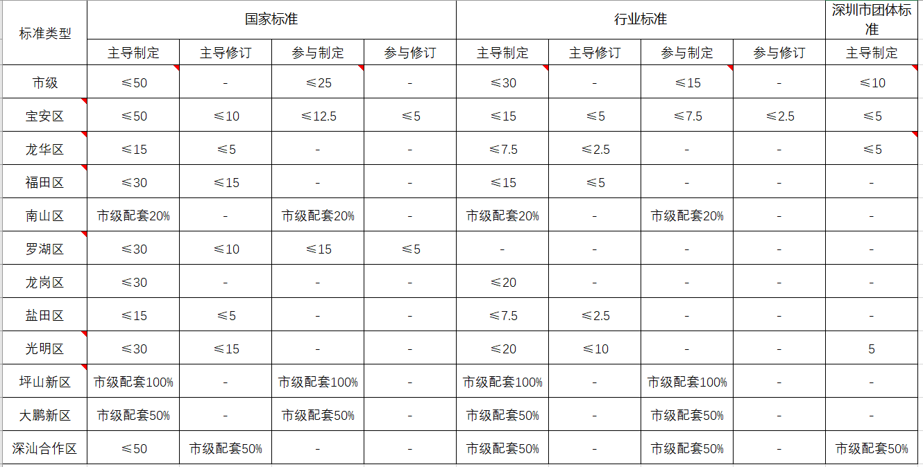 政府鼓勵(lì)企業(yè)參與標(biāo)準(zhǔn)規(guī)范及制定,針對(duì)參與標(biāo)準(zhǔn)制定的企業(yè),市、區(qū)級(jí)根據(jù)企業(yè)參與程度(排名)均有獎(jiǎng)補(bǔ),國(guó)家標(biāo)準(zhǔn)深圳市最高50萬(wàn)補(bǔ)貼,各區(qū)最高15萬(wàn)至50萬(wàn)元補(bǔ)貼。