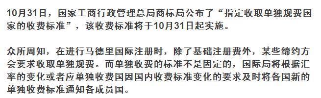 2.單獨收費的標準不是固定的,國際局將根據(jù)匯率的變化或者應單獨收費國因國內收費標準變化的要求及時將各國新的單獨收費標準通知各成員國。(請登錄www.wipo.int進行查詢)