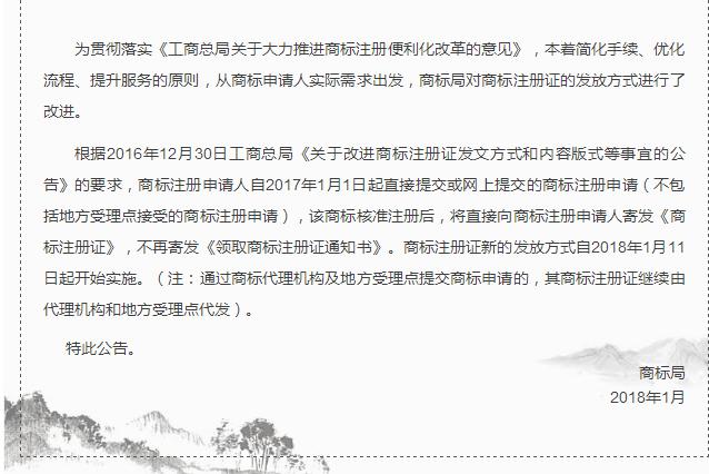 商標(biāo)注冊(cè)證新的發(fā)放方式自2018年1月11日起。